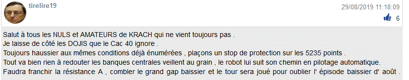 Les amateurs de Krach totalement disparus de la file souffrent énormément du supplice que leur fait avaler le ROBOT, suis toujours haussier avec stop toujours à 5235 points .