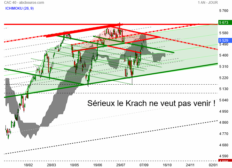 Toujours pas de Krach en vue , désolé revoyez votre position , objectif 5600 puis 5650 points pas besoin de gesticuler c' est écrit d' avance .