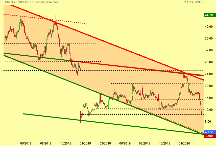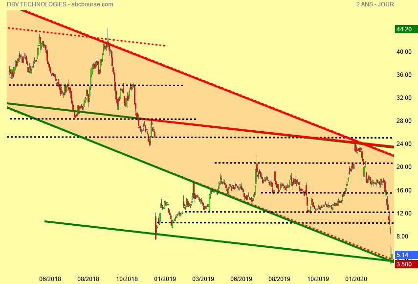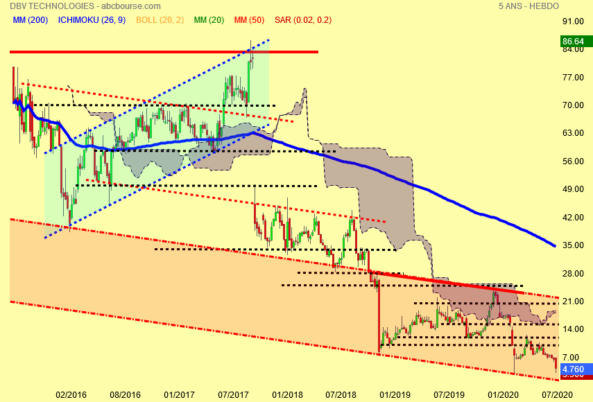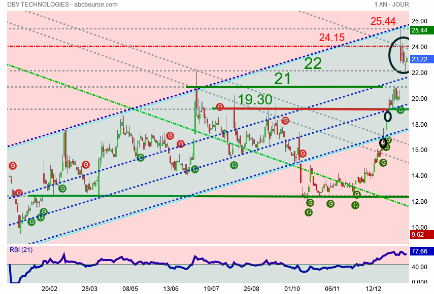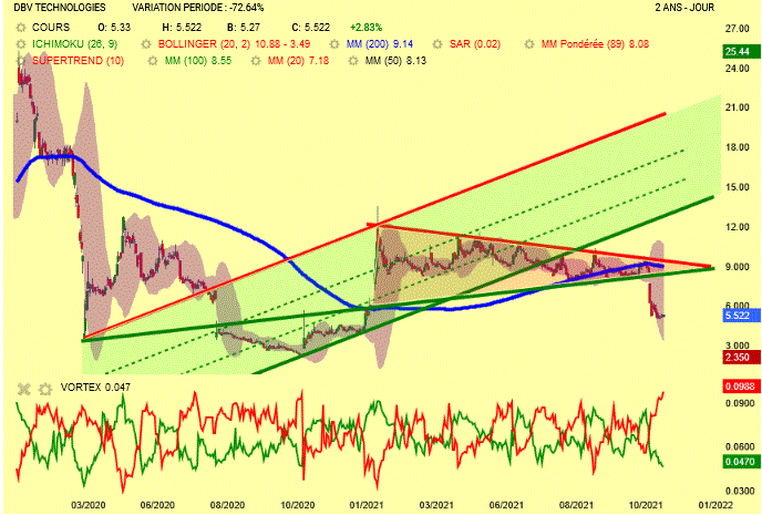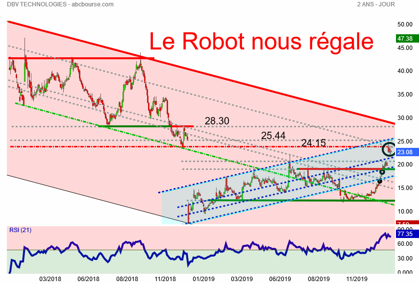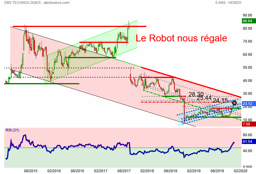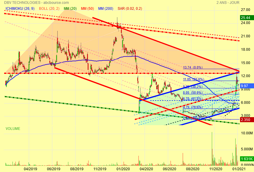 Attention sur Dbv Techno, on pourrait penser qu'elle sort d'une congestion et qu'il est opportun de se placer, il y a pourtant une énorme divergence baissière sur la MACD qui laisse imaginer un point haut, ou une consolidation brutale après cette hausse.