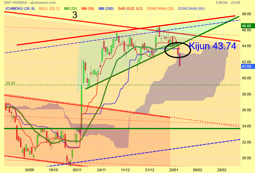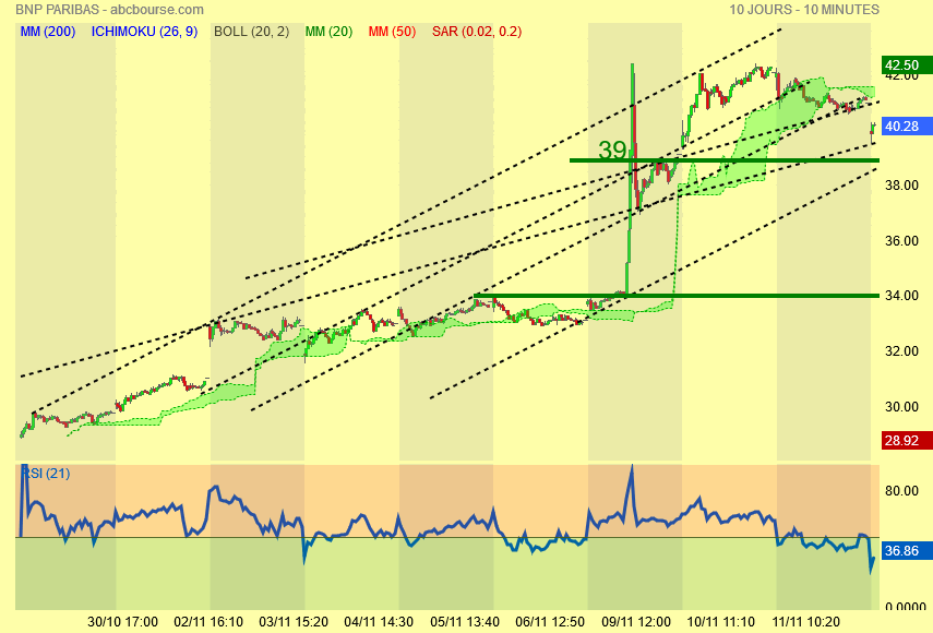 Vue intra day : même conclusion que pour le crédit agricole , le cours succombe aux prises de bénéfices , on passe sous le nuage , premier support à 39 euros .