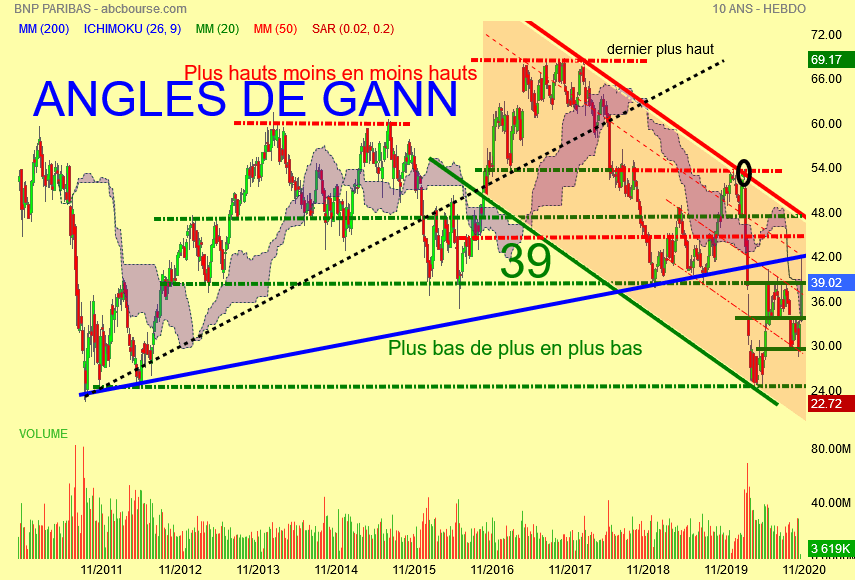 En conclusion : Pull-back technique sur angle de Gann de couleur bleu avec échec à franchir les 39 euros résistance du range indiqué .