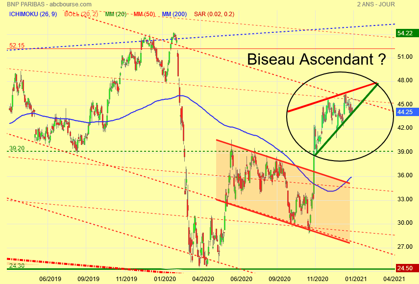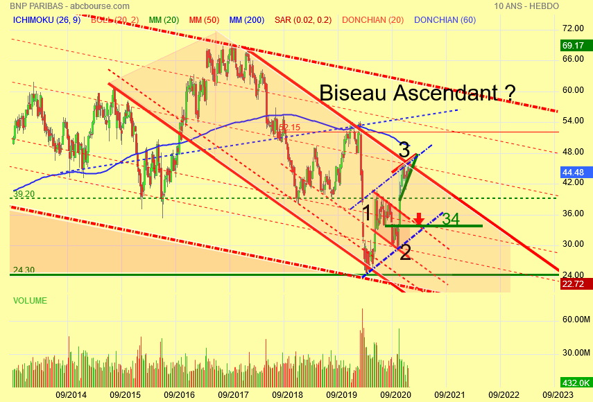 On peut avoir une sortie haussière , rare mais possible dans le cas d' un biseau ascendant ou sortie baissière pour rejoindre le bas du canal haussier bleu à 34 euros hypothèse à ne pas écarter .