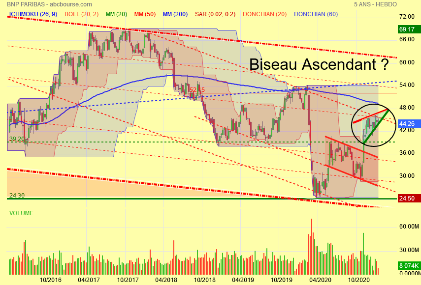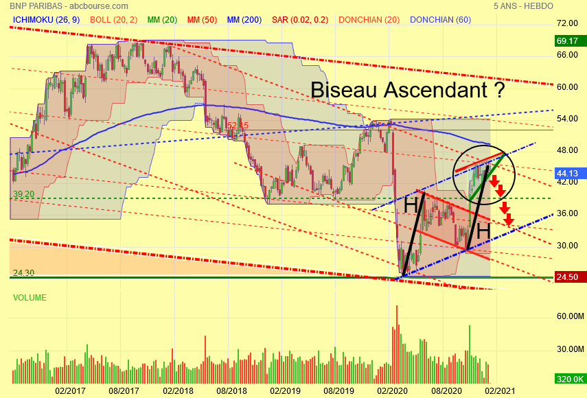 Le BISEAU ASCENDANT est bien présent , la baisse des volumes aussi comme pour le crédit agricole