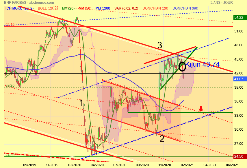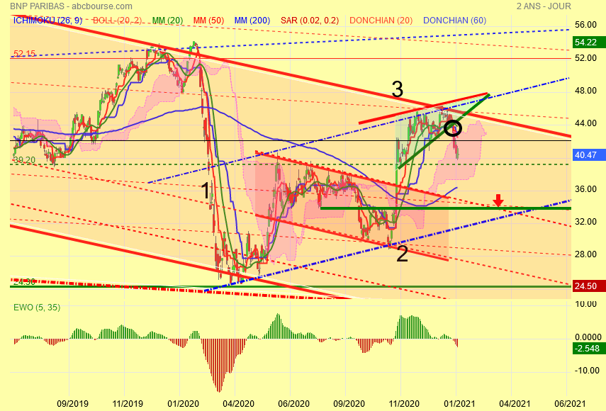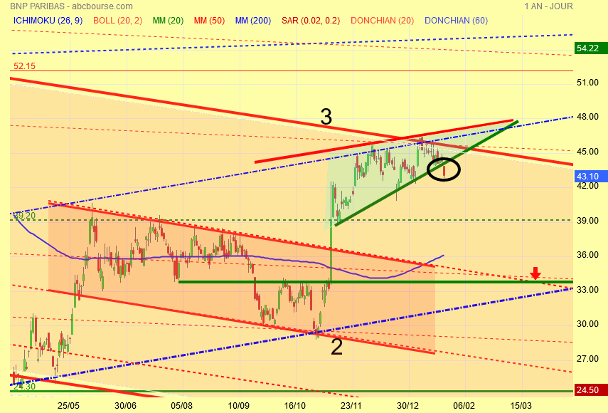 Voyez le canal baissier rouge du bas , il n' y a pas eu de pull-back , il se fera donc la correction à venir sera importante pour effectuer le pull-back avant la reprise haussière disons 33.50 - 34 euros