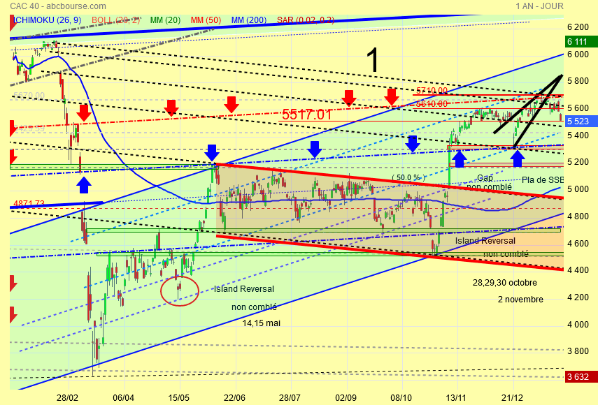 Il y a le BISEAU ASCENDANT BLEU et le décompte des Vagues d' Elliott avec un Cac 40 sur le plus haut ou presque.