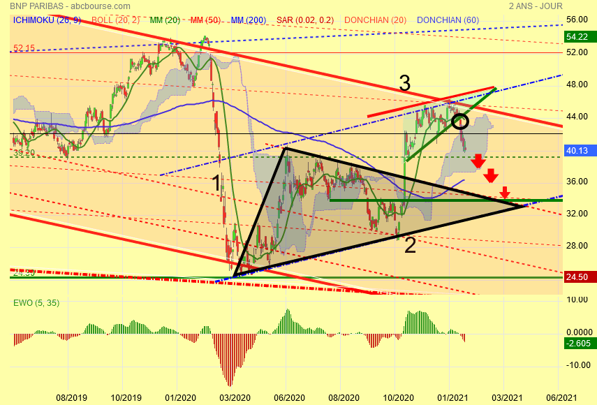 Retour sur le passé pour expliquer le pourquoi du comment de la chute de BNP entre 69 et 24 euros : tout est parti du DIAMANT de sommet tracé en noir .
