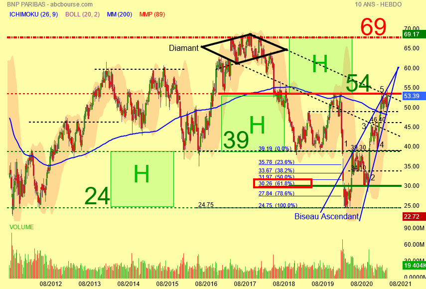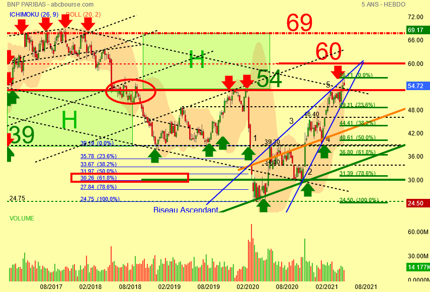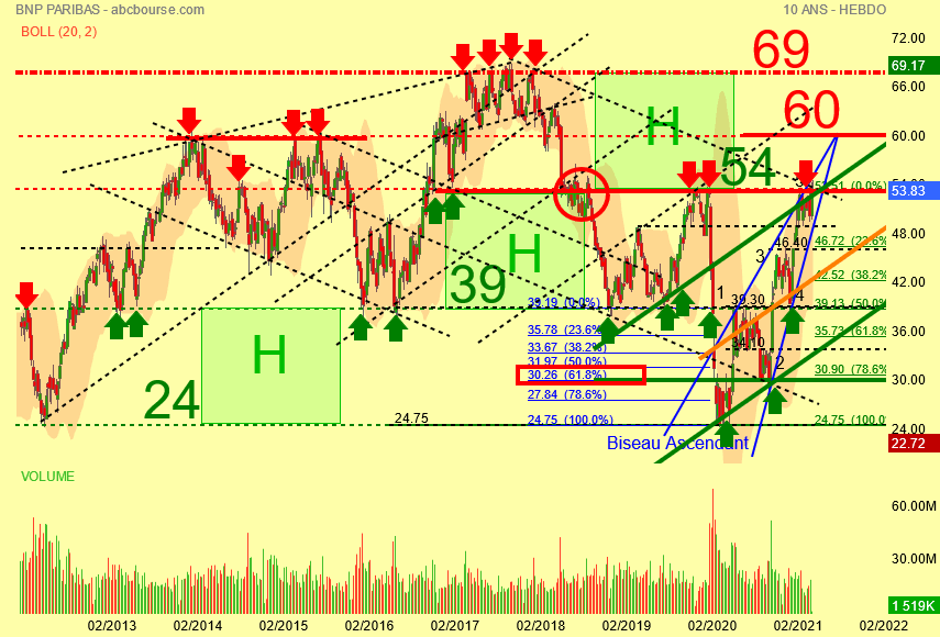 Depuis le 16 mars 2020 , pas de problème c' est la reprise haussière depuis 24 euros et là aussi on rajoute les vagues d' Elliott pour le décompte c' est simple , bien visibles elles sont au nombre de 5 et mieux encore le rebond de 24 à 53 euros s' inscrit dans le BISEAU ASCENDANT BLEU et ce qui est encore plus net ce sont les évolutions des volumes à l' intérieur du BISEAU ASCENDANT : c' est la diminution pure et simple de ceux çi .