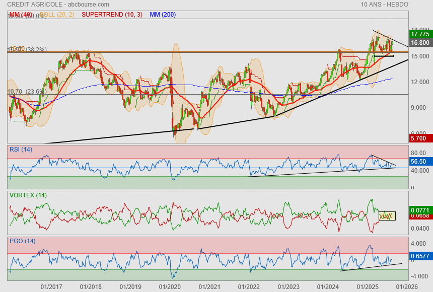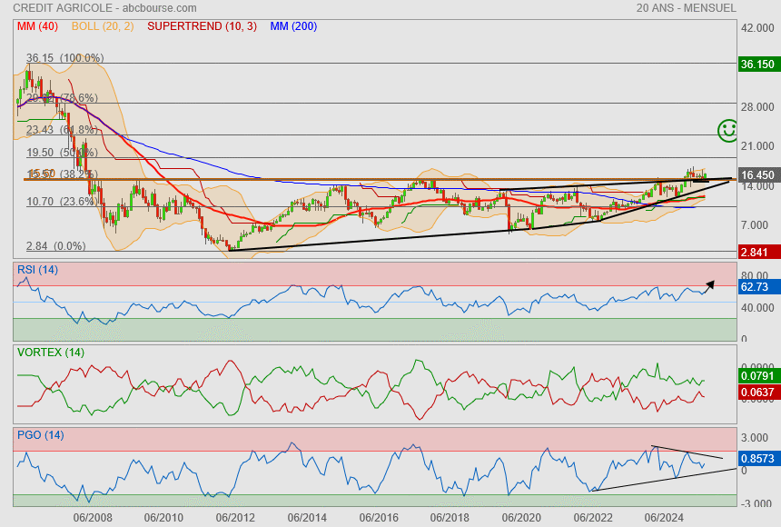 Tout d'abord, la surtaxe sur l’impôt sur les sociétés a été un facteur déstabilisant pour la rentabilité nette de la banque. Bien que cette mesure soit exceptionnelle, elle a eu un impact direct sur les résultats financiers du groupe, réduisant ses marges et mettant en lumière la pression fiscale croissante à laquelle les entreprises françaises sont soumises. De plus, bien que les revenus aient augmenté, le titre du Crédit Agricole a sous-performé par rapport à ses concurrents du secteur bancaire. L’action a affiché une performance relative de -0,2 % par rapport à l’indice STOXX600 sur les quatre dernières semaines, ce qui suggère que le marché reste hésitant face à la valorisation de l’action.