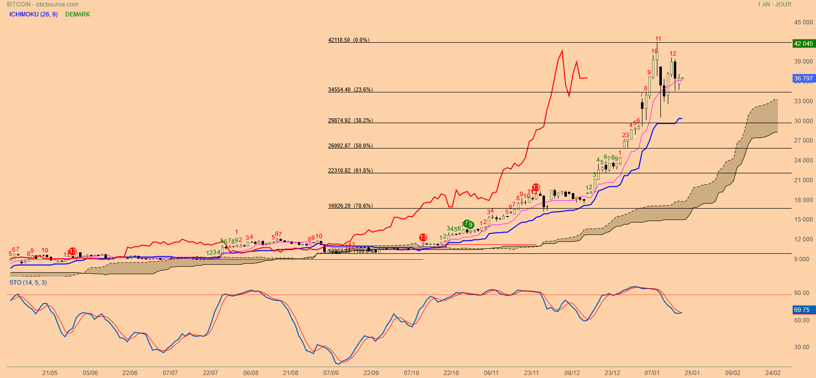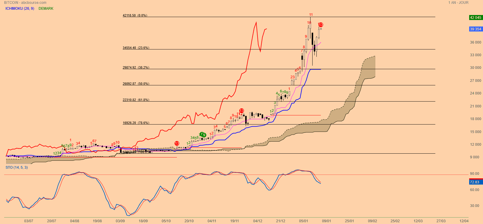 Attention les grosses mains aiment quand l'espoir est à son zénith, ils pourraient nous refaire la même, mais on a des yeux pour voir que l'on arrive sur une bougie 13 de DEMARK, sur une divergence baissière Ichimoku et une Stochastique daily qui repart dans un cycle baissier.