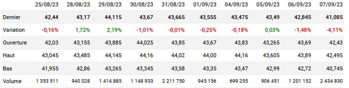 Cours enregistré en clôture du 7 septembre 2023 à 41.085 € en baisse de 4.11 %