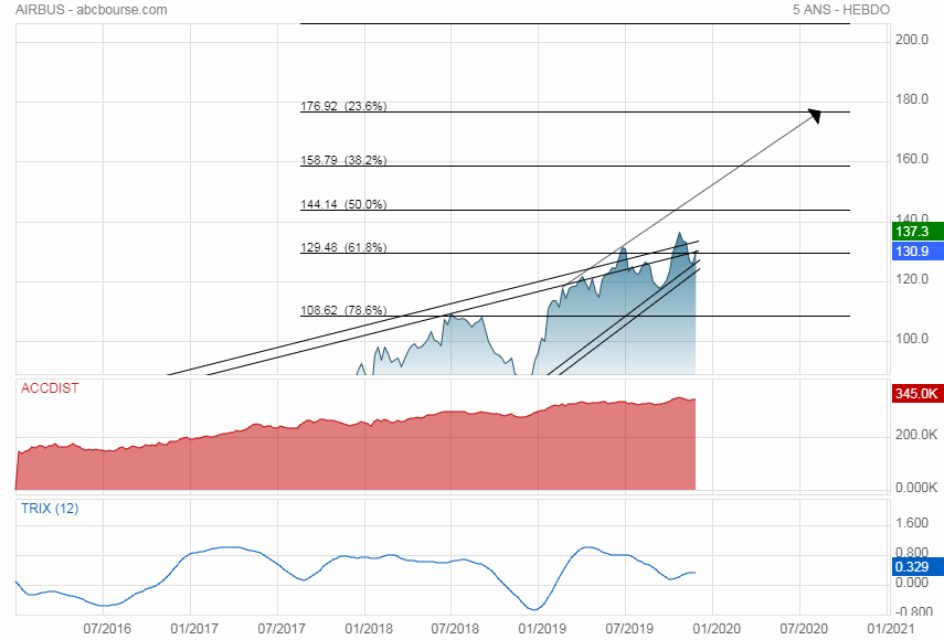Je n'ai pas de boule de cristal donc je vais pas dire si c'est possible ou non par contre je reste à l'écart d'Airbus pour une raison simple, sa structure de prix est plutôt inquiétante car les grosses mains ont ramassé le papier il y a bien longtemps, on voit un ramassage vers les 20-25€ puis vers les 50€ après il y a bien un niveau intermédiaire vers les 100€ ou certain gérant on du prendre des bénéfices considérable lors de la "phase corrective" de 2018 mais il n'y a pas eu tant de dégagement que ça.