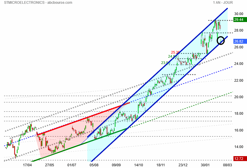 (CercleFinance.com) - Le titre STMicro chute de près de -3% à la Bourse de Paris après l'annonce des objectifs d'Apple. Le groupe est un fournisseur important de la marque américaine au même titre que AMS (-3%).