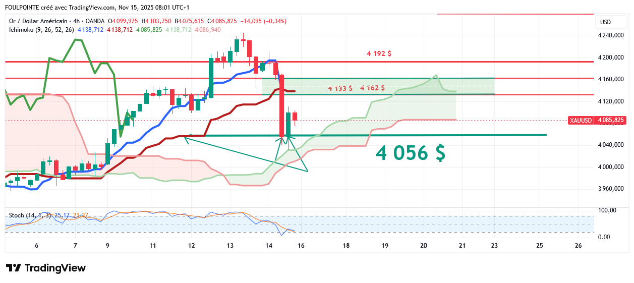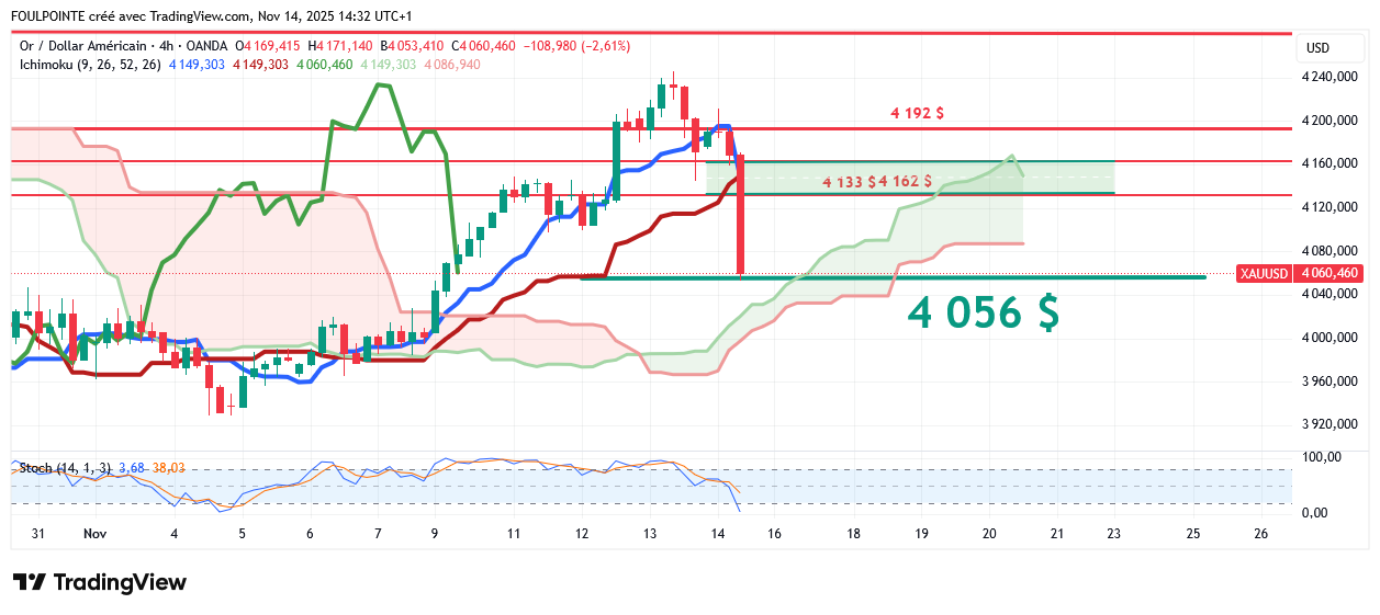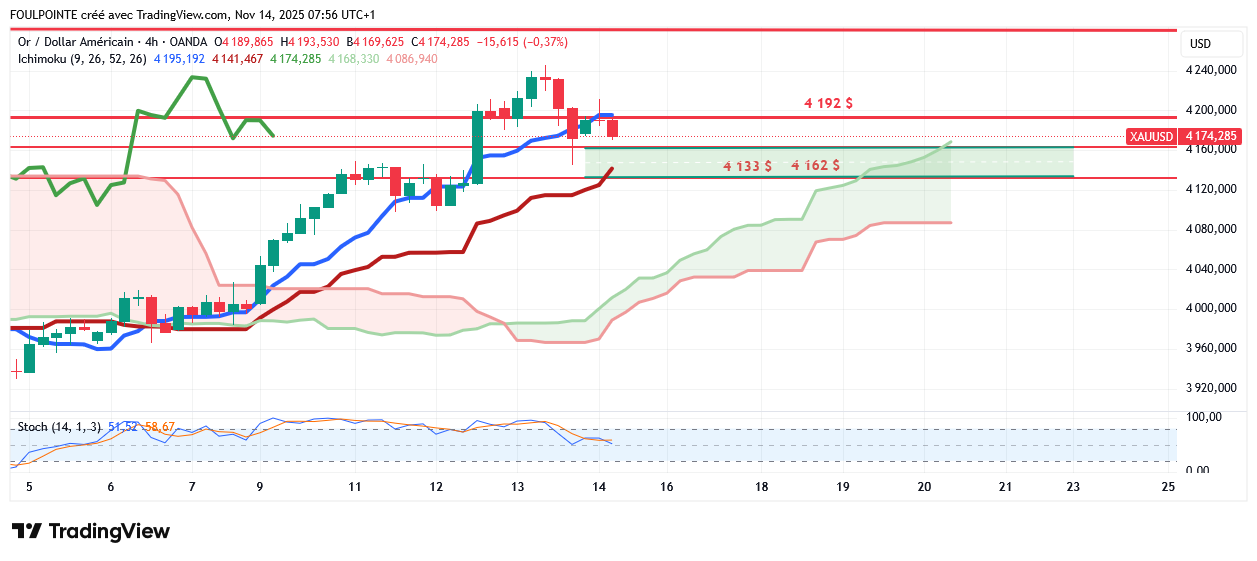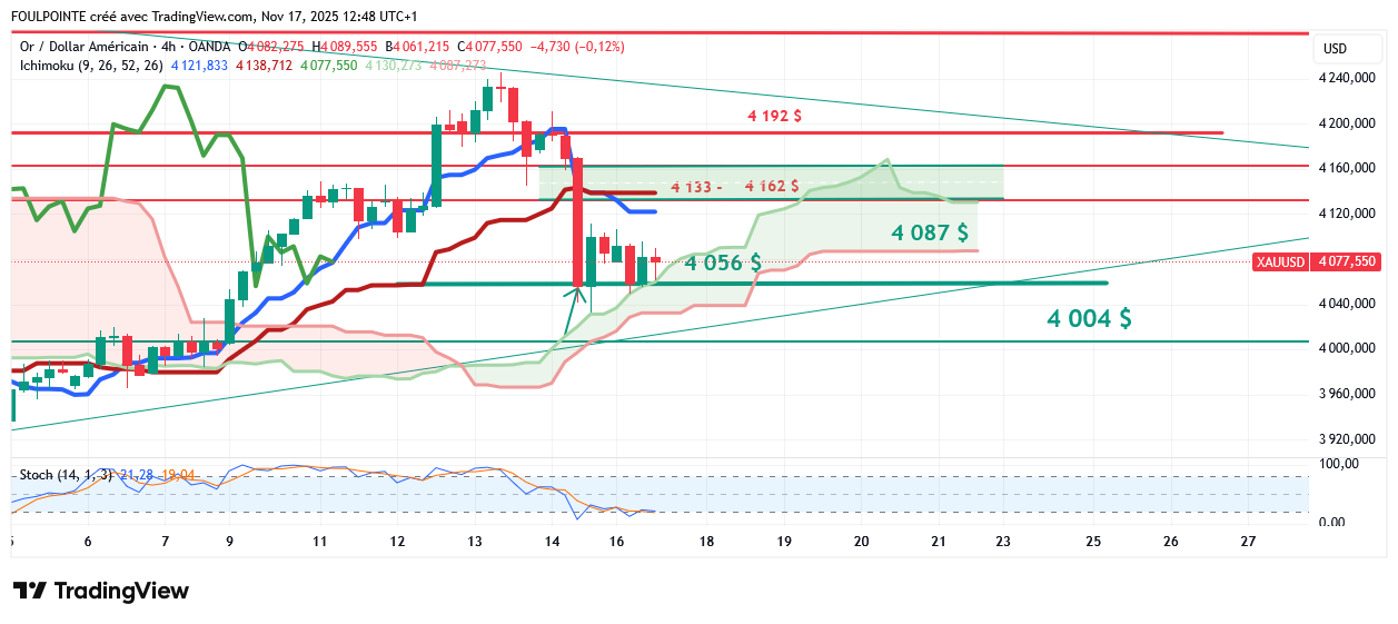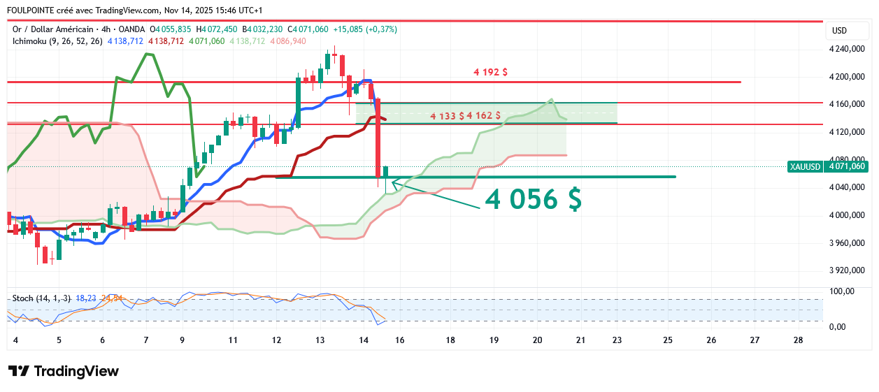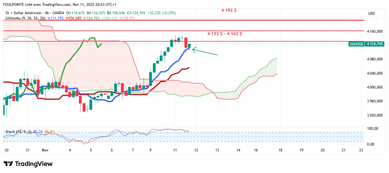 Selon certains analystes, le repli de l'or s'explique par l'évolution des anticipations de taux d'intérêt, qui a entraîné un repli généralisé du marché, le Bitcoin et les actions perdant également du terrain. Bien que la paralysie des services gouvernementaux américains, qui a duré 43 jours, soit terminée, certains économistes craignent que la collecte de données économiques n'ait été fortement perturbée. Le manque de données fiables contraint la Réserve fédérale à adopter une position neutre en matière de politique monétaire, ce qui pourrait entraîner le maintien des taux d'intérêt inchangés le mois prochain.
