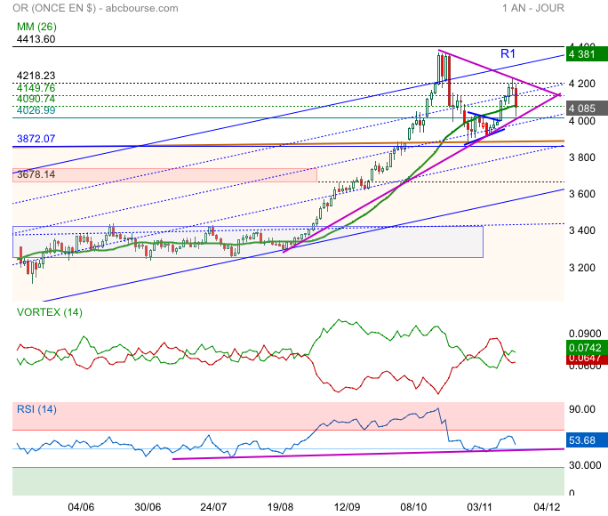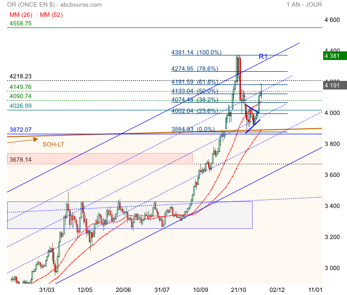 Toujours haussier. De nouvelles touchettes sur les plus bas des 3 886 $ ne sont pas à écarter, mais ces creux sur ce niveau des 3 886 $ seront rachetés.