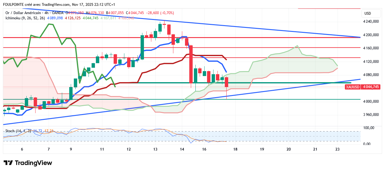 « Le discours belliqueux de la Fed, suggérant une pause potentielle le mois prochain, risque de freiner la hausse du métal jaune pour le moment. Vous constaterez que l'or a chuté de près de 3 % aujourd'hui, et si le cours franchit la barre des 4 000 $ – un seuil très surveillé – et que le plancher de 3 886 $ atteint fin octobre se confirme, cela pourrait déclencher une forte pression à la vente jusqu'à 3 748 $, à mon avis », a-t-il déclaré. « Par conséquent, même si la tendance est clairement favorable aux acheteurs à long terme, nous pourrions subir quelques pertes supplémentaires, surtout si nous absorbons les ordres d'achat à 3 886 $. »