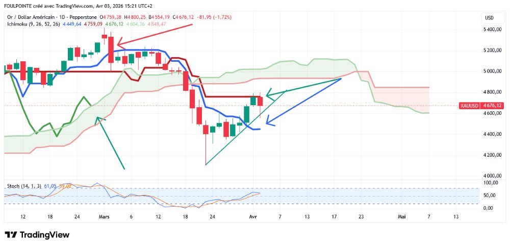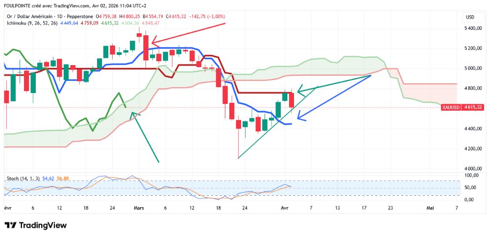Hier la bougie du 31 mars 2026 a fait un plus bas sur les 4 482 $ pile poil sur la tenkan qui était sur les 4 483 $. Les cours se sont donc " assurés " de " l'accord de la tenkan pour remonter.