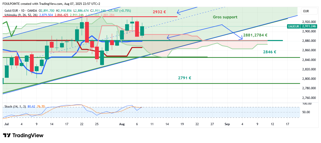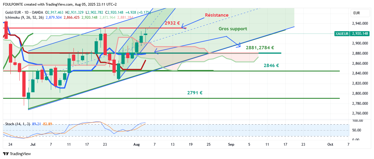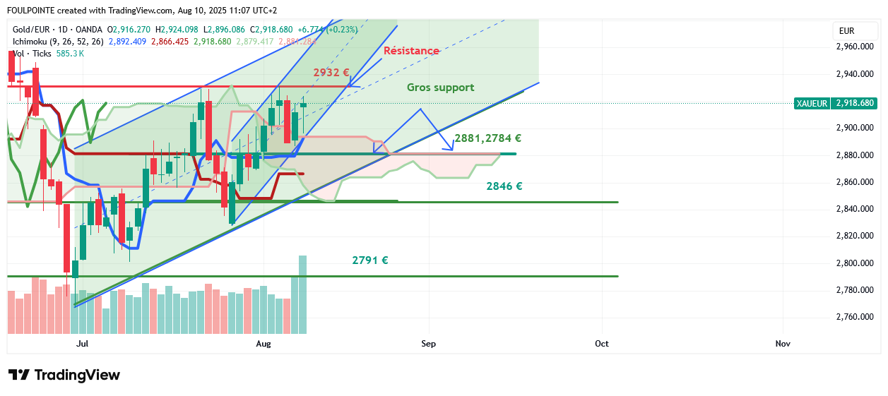 Tant que la tenkan du jour restera plate et n'appuiera pas les cours en se positionnant juste en dessous la probabilité est que nous ne franchirons pas les 2 932 €. Mathématiquement la tenkan, qui est la moyenne arithmétique des 9 dernières bougies, devrait commencer à grimper le vendredi 8 août jour de l'ultimatum de Trump à Poutine.