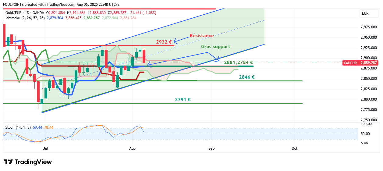 En baisse actuelle de 1,09 % sur les 2889 € les baissiers invalident la sortie haussière.