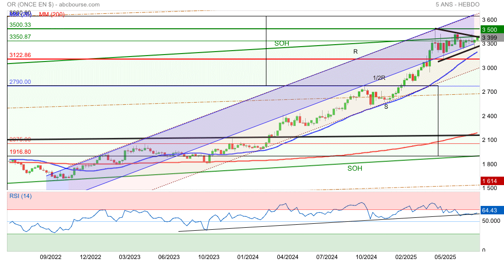 Aujourd'hui les stats des demandes d'emplois us, nettement moins bonnes que prévues, si elles en sont bien à l'origine, sont venues contrecarrer les positions baissières prises hier suite notamment à l'annonce d'une 1 ère rencontre Trump/Poutine et viennent renforcer la probabilité de prochaines baisses des taux de la FED. Se faisant elles facilitent les achats d'Or, celle-ci ne délivrant pas de rendement mais offrant à son propriétaire une protection contre l'érosion monétaire.