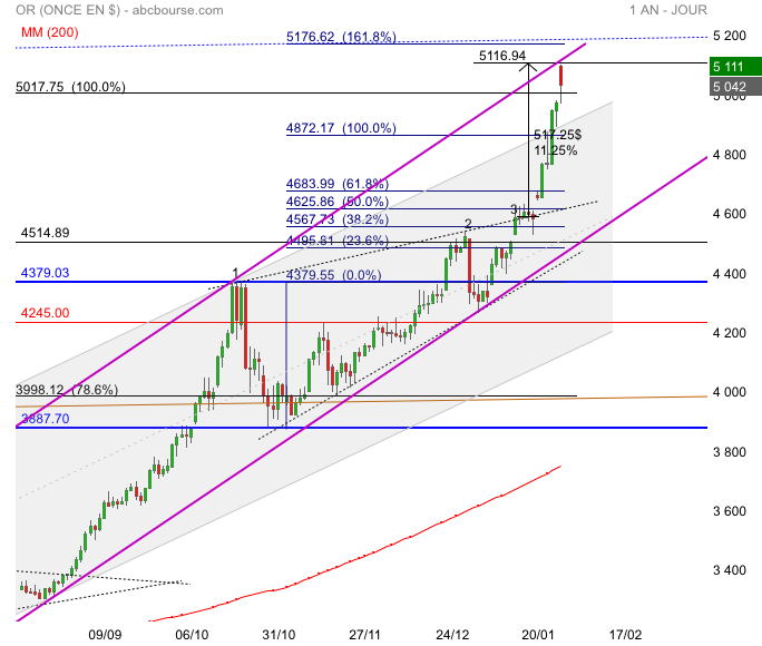 Après avoir tapé les 5 100 $ l'Or tient juste les 5 000 $ en clôturant en légère hausse de 0,43 % sur les 5 008 $: