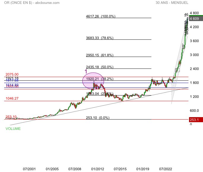 Si on trace à partir de 253 et on considère le point 1 comme haut de vague à 1921.18 représente ratio 38% nous aurions 100% 4617-4620 point de test actuel …