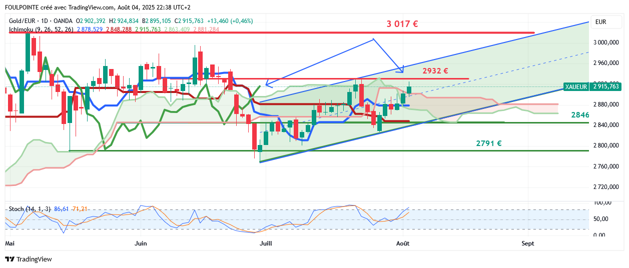 La remontée des cours s'est une nouvelle fois heurtée à cette résistance des 2932 € par les deux bougies des 22 et 23 juillet 2025 dont les deux plus haut sur les 2929,048 € et 2929, 380 € étaient venus mourir sur les 2932 €.