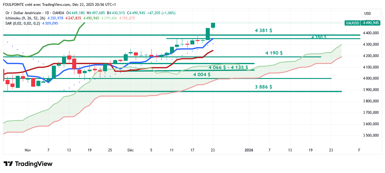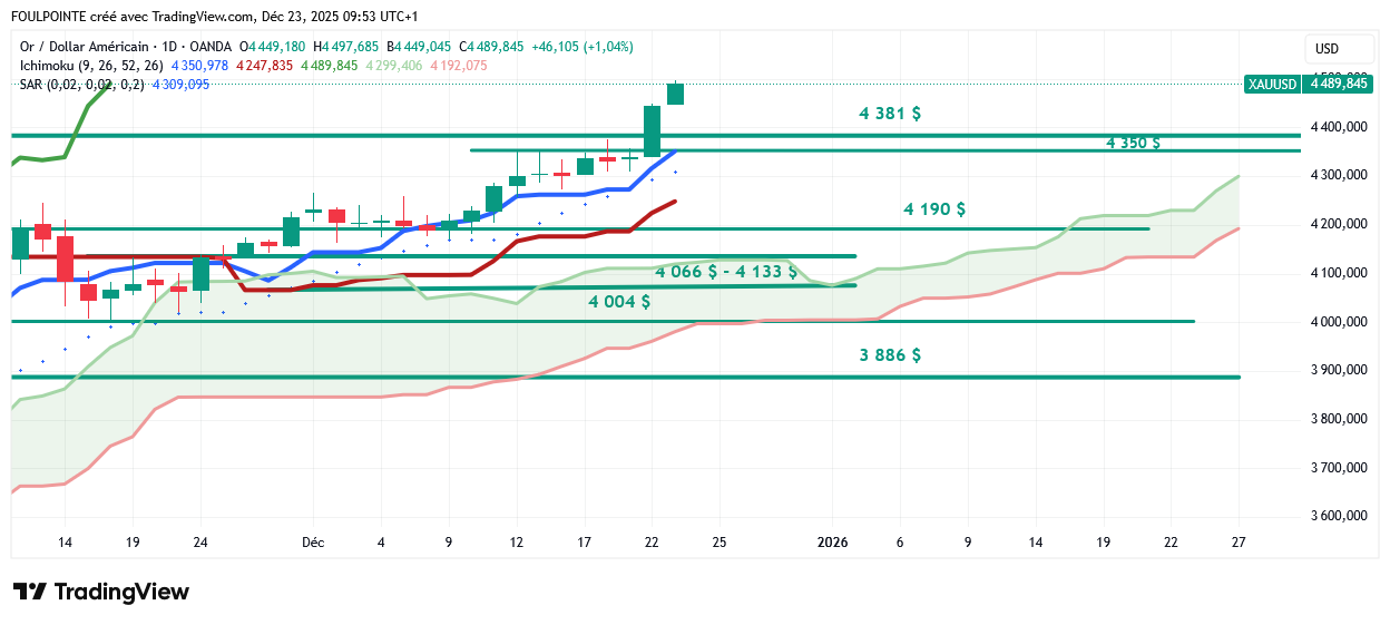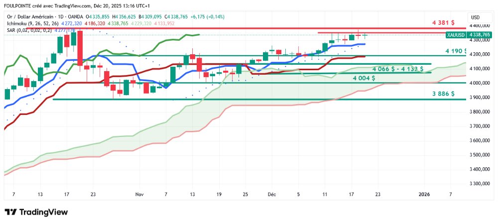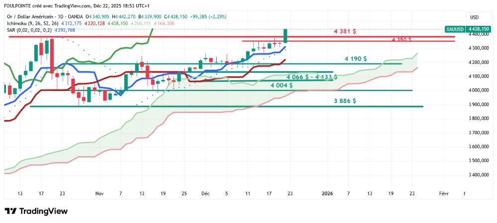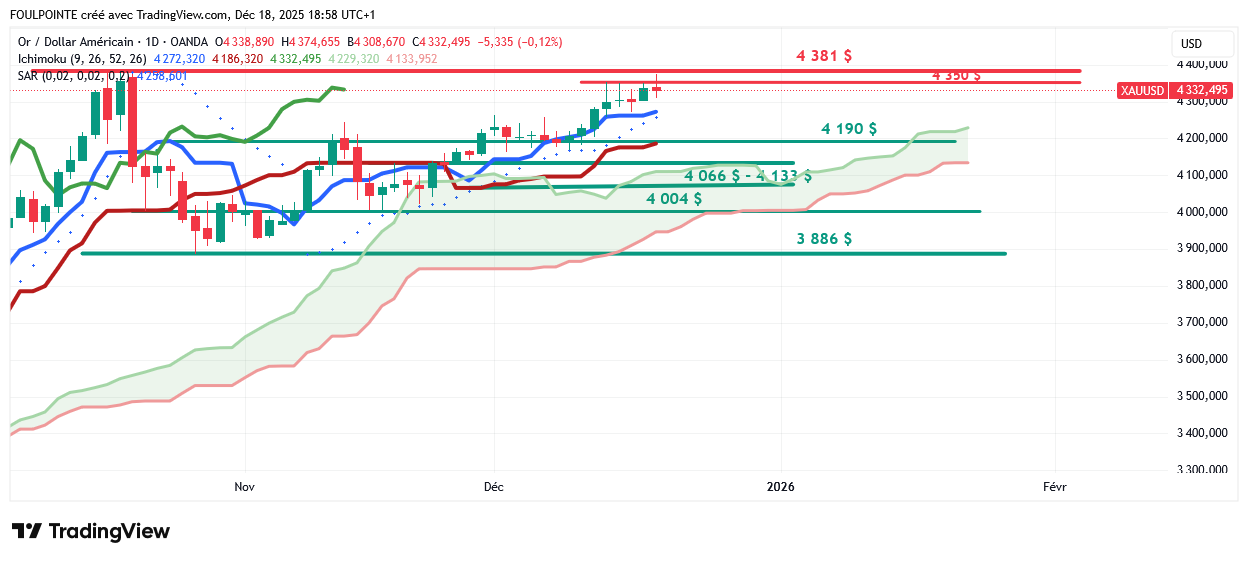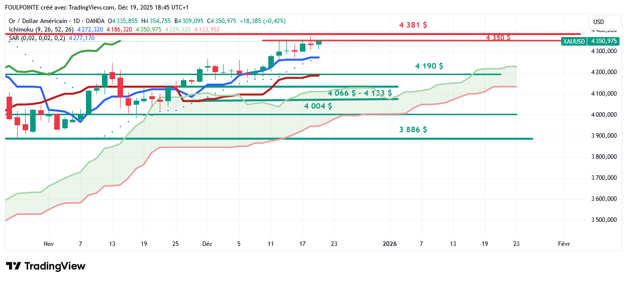 D'un point de vue technique, l'or (XAU/USD) a franchi la zone de résistance des 4 350 $ et la dynamique haussière vise désormais le record historique autour de 4 381 $.
