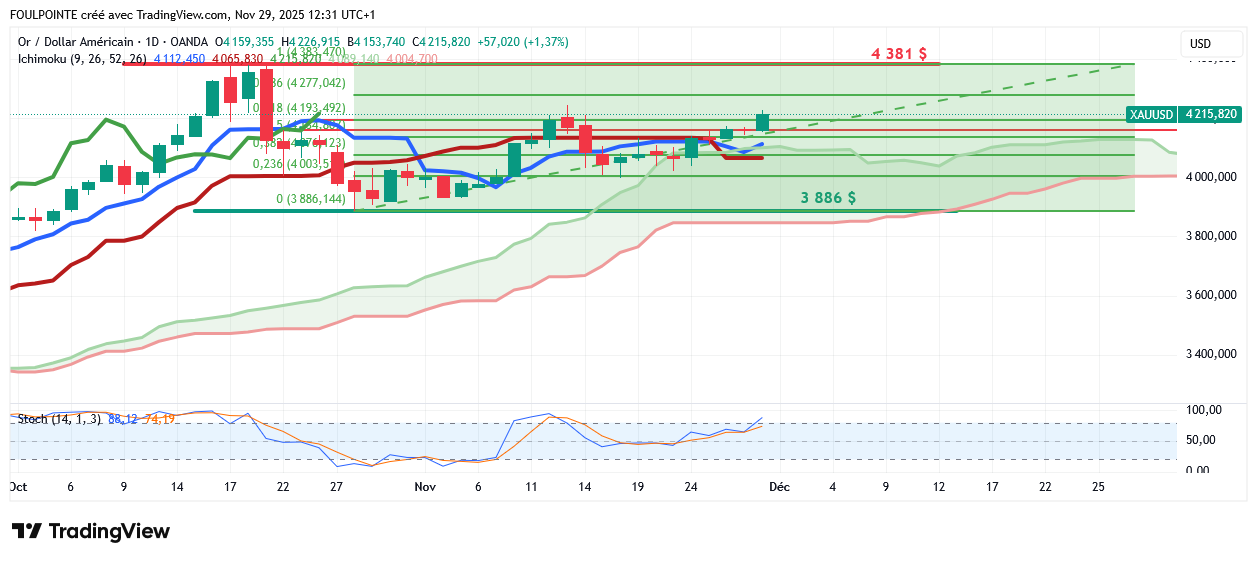 Le haut de la fourchette étant désormais bien établi, les traders asiatiques n'ont pas tardé à propulser le métal jaune vers un nouveau sommet hebdomadaire, frôlant les 4 170 dollars l'once. Par la suite, le canal s'est encore resserré, l'or au comptant s'échangeant entre 4 145 et 4 170 dollars pendant le week-end de Thanksgiving aux États-Unis.