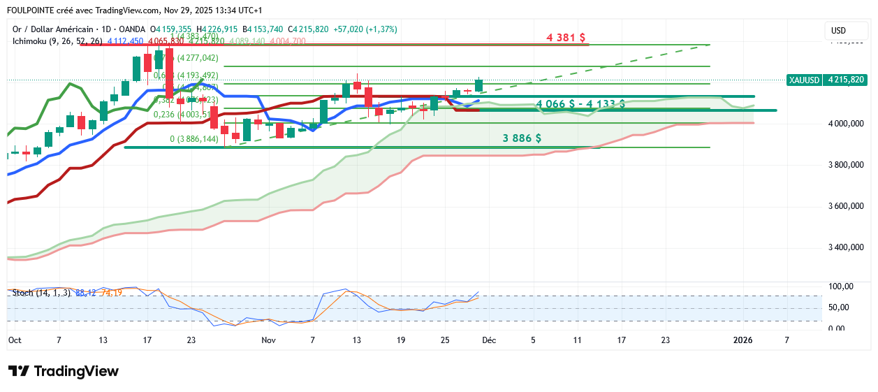 M. Chandler a indiqué que l'or « semble avoir franchi la ligne de tendance baissière reliant le record de fin octobre (environ 4 381 $) au sommet de novembre (environ 4 245 $) ».