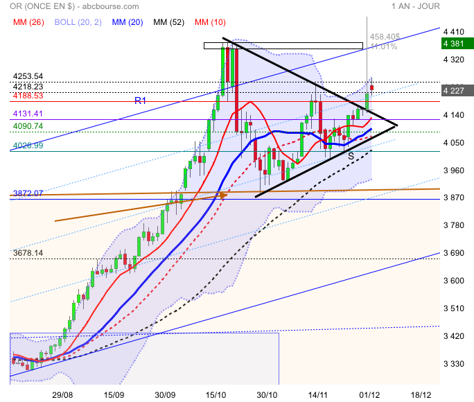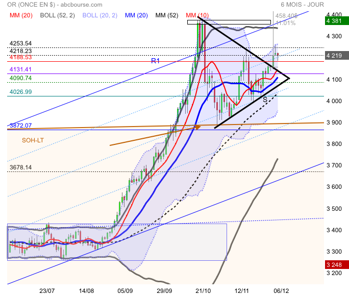 Les cours depuis la baisse initiée le 21 octobre et le rebond initié le 28 du même mois se trouvent, comme déjà mentionné, en rebond technique, dans un range 4 381 $ - 3886 $. A l'intérieur de ce range les cours ont entamé une 1 ère remontée au sein d'un canal modérément haussier, puis ont accéléré leur hausse à compter 21 novembre dernier au sein d'un nouveau canal plus pentu. Se faisant ce nouveau canal a conduit les cours jusqu'au dernier plus haut en clôture de 6 semaines sur les 4 232 $.