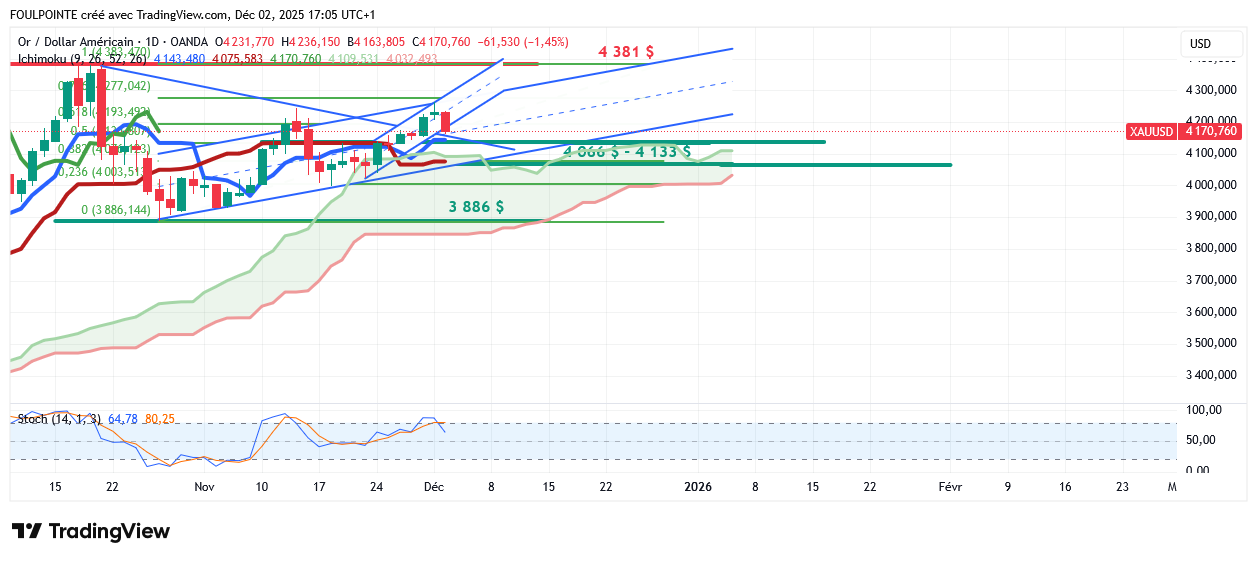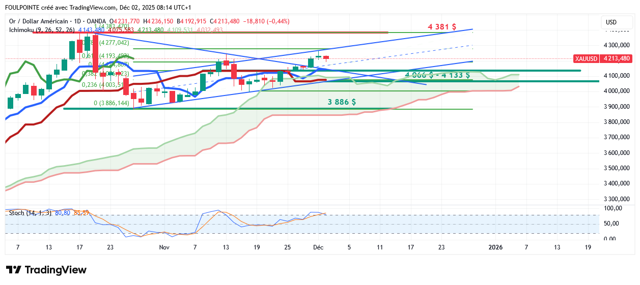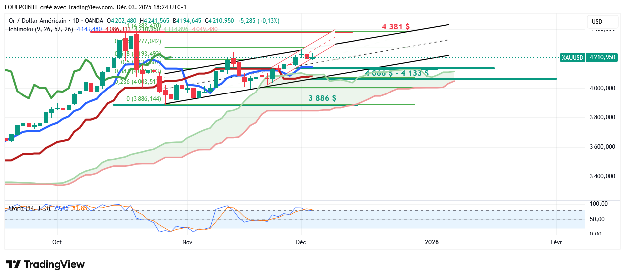 « Ces mouvements sont difficiles à suivre car il est toujours possible que les investisseurs à long terme profitent du rebond pour prendre des bénéfices avant la fin de l'année », a ajouté Stanley. « Mais comme je le dis depuis le début de cette formation, ce support reste attractif, et la zone des 4 150 $ représente un autre point d'entrée intéressant. »