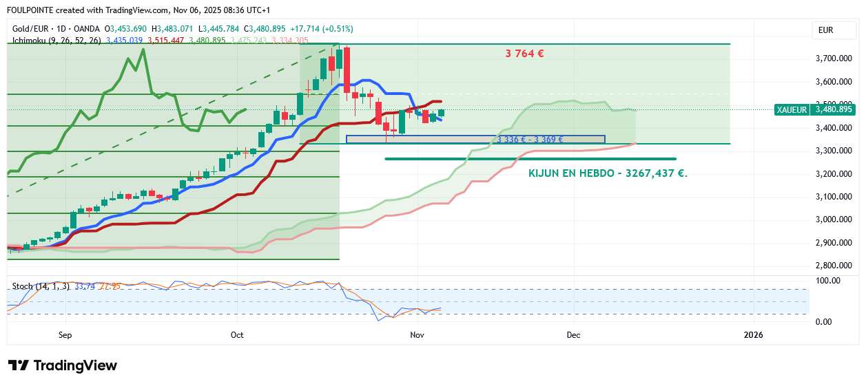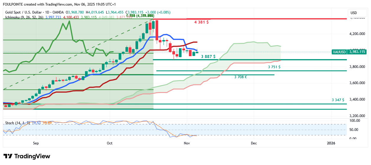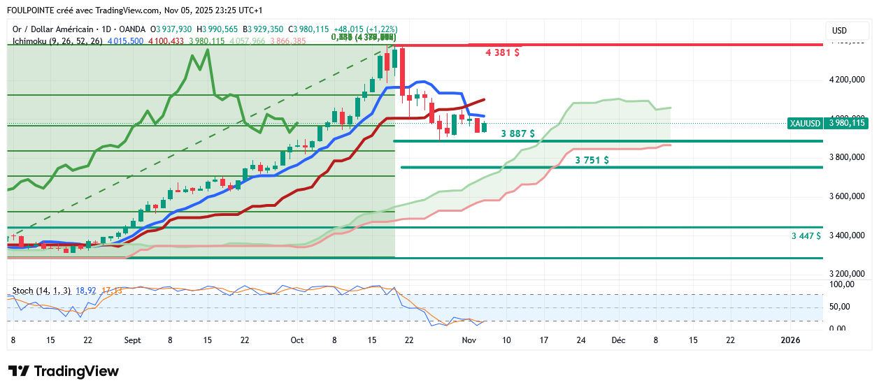 À la baisse, la MMS à 50 périodes, située à 3 985 $, fait office de support immédiat. Un passage durable sous ce niveau pourrait engendrer de nouvelles pressions à la vente et exposer le plancher des 3 900 $, où des achats répétés sur repli ont jusqu'à présent contenu les vendeurs.