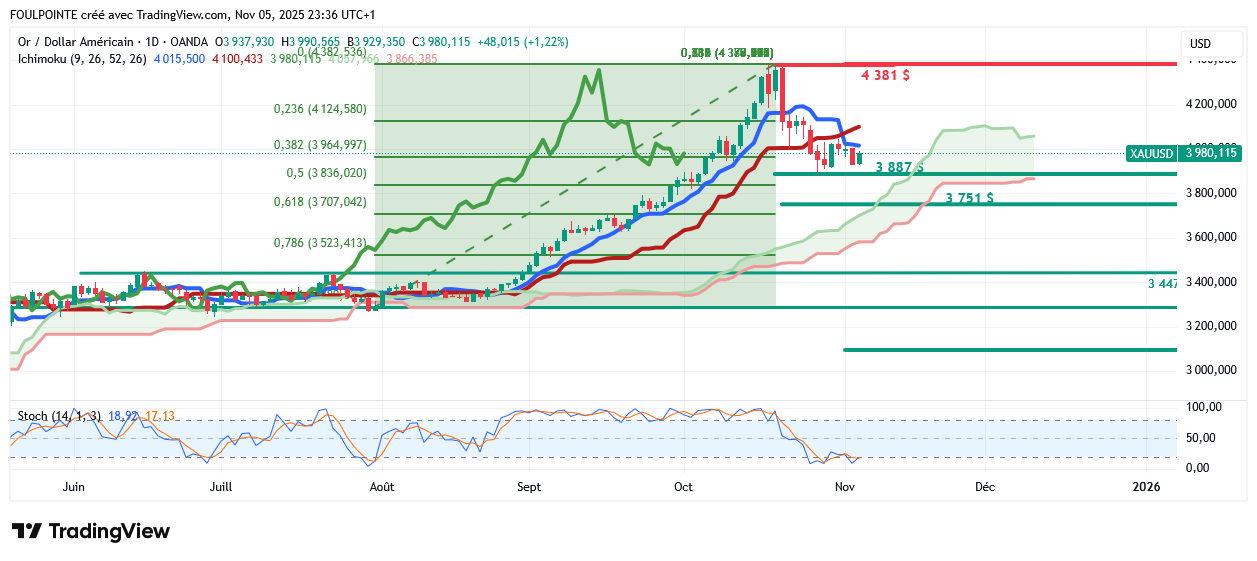 À la hausse, les acheteurs font face à un test difficile au niveau de la zone de résistance des 4 020 $ - 4 050 $, qui a bloqué toutes les tentatives de hausse ces derniers jours. Un franchissement net de cette barrière pourrait déclencher une dynamique haussière vers la zone des 4 100 $ - 4 150 $.