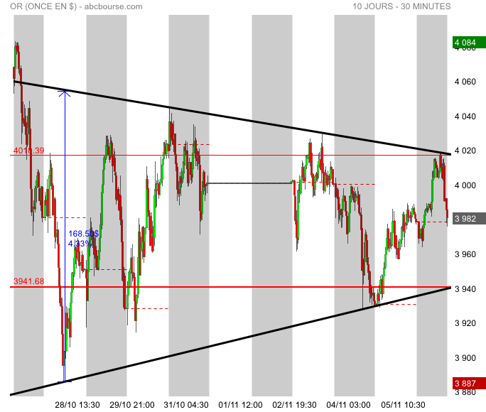 Mais les chiffres sont là. Il n'est pas question de vouloir les triturer dans un sens comme dans un autre mais depuis le 28 octobre on est dans un canal horizontal clairement délimité : 4 024 $ en haut et 3 887 $ en bas.
