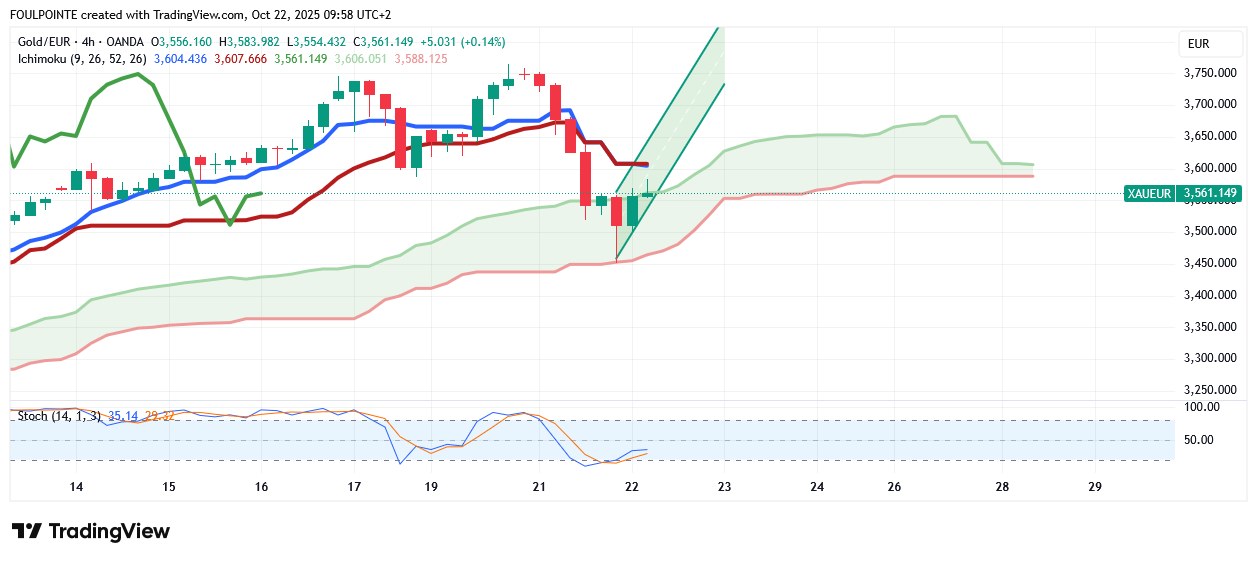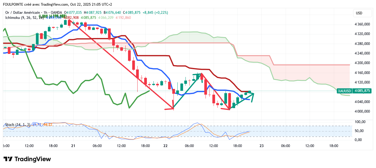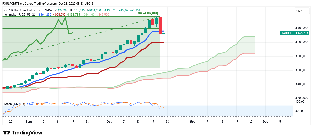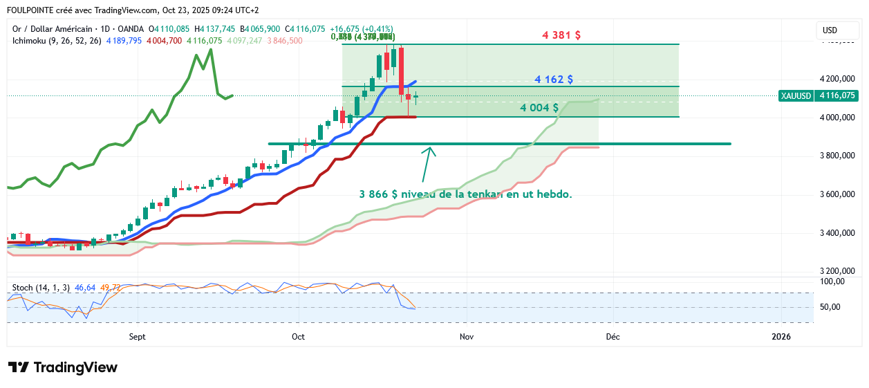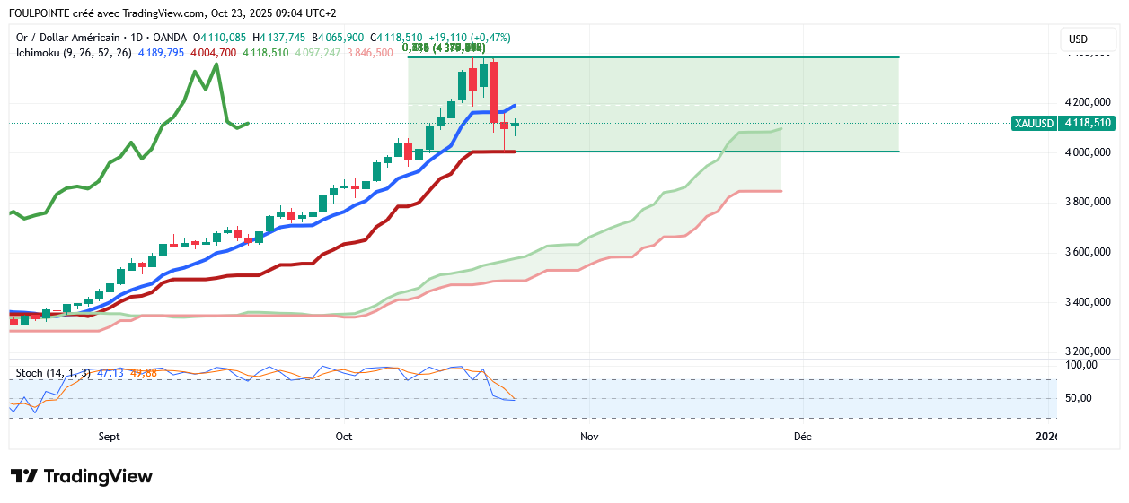 Le niveau de résistance immédiat à surveiller est de 4 140 $, le plus haut du 15 octobre. Si les acheteurs interviennent, l'or pourrait bénéficier d'une nouvelle dynamique haussière vers 4 330 $, le plus haut du 16 octobre. Le prochain obstacle se situe à la limite supérieure des bandes de Bollinger, à 4 365 $.