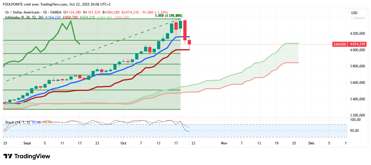 À la baisse, le support crucial pour la paire XAU/USD se situe au niveau psychologique de 4 000 $. De nouvelles bougies baissières et une action soutenue sous le plus bas du 10 octobre à 3 947 $ pourraient ouvrir la voie à une baisse qui porterait le cours à 3 838 $, le plus bas du 3 octobre.