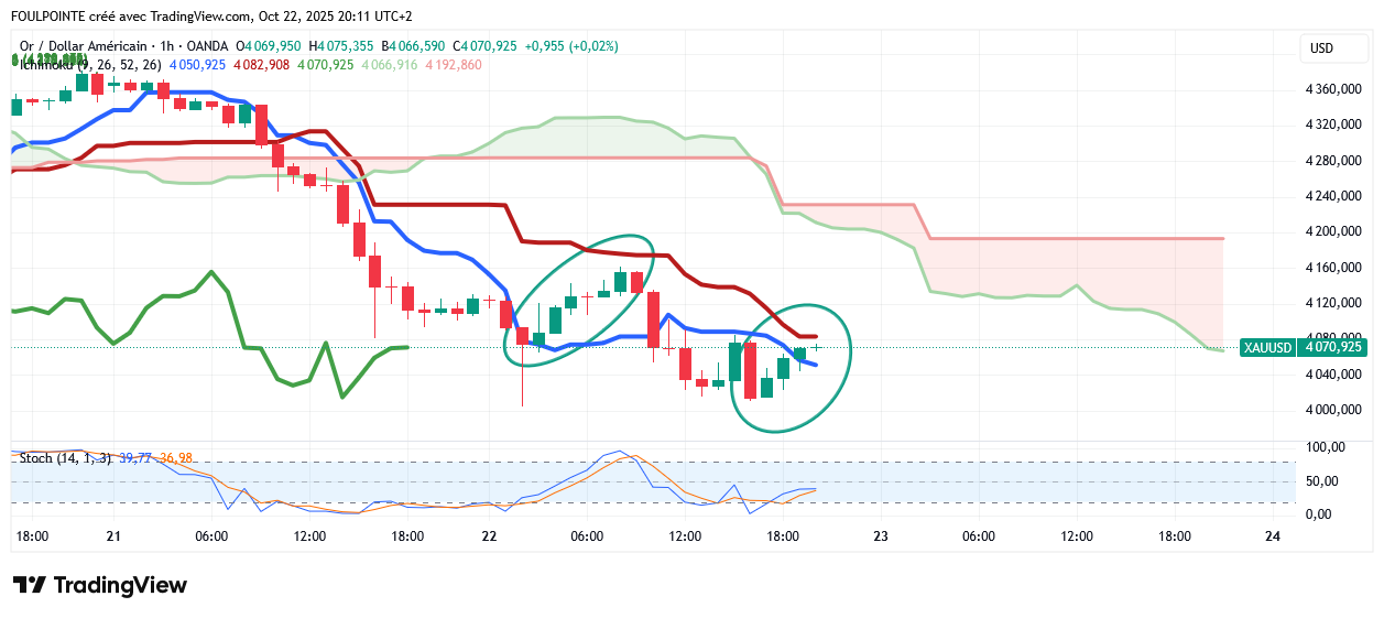 Aujourd'hui les cours ont fait un plus bas sur les 4 004,280 pour une kijun à 4 004,700. Le niveau a été sollicité et a tenu.