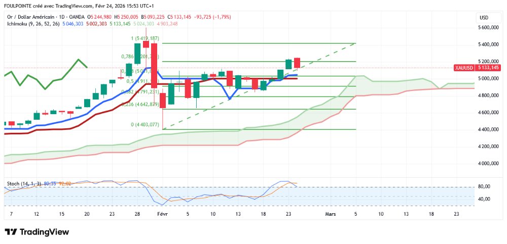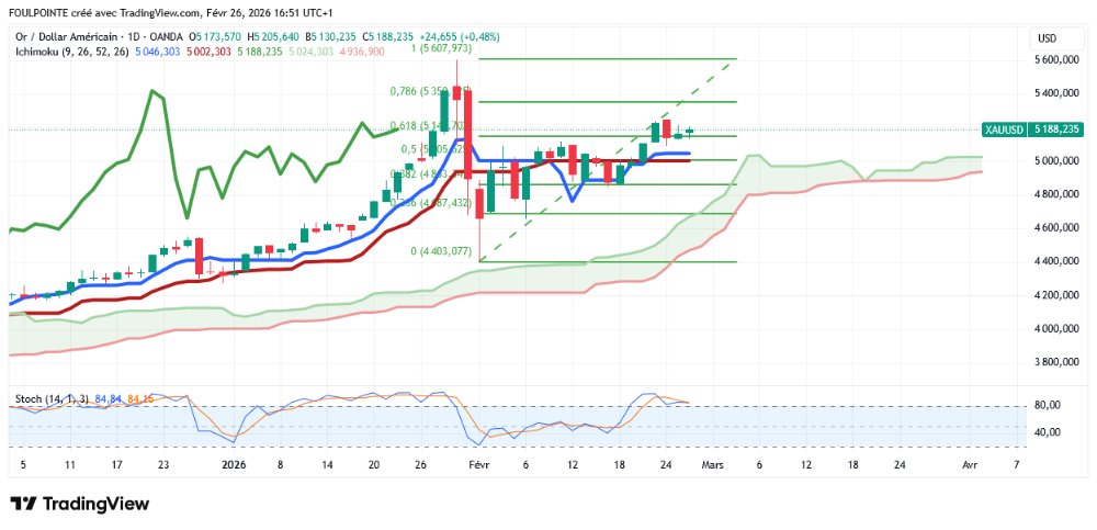 À la baisse, les niveaux de support clairement définis pour l'or tracent la trajectoire structurelle à la baisse si le prix clôture sous le support de 5 100 $. « Si nous clôturons à nouveau sous la barrière des 5 100 $, nous pourrions nous attendre à de nouveaux risques de consolidation dans la zone s'étendant jusqu'à la barre des 4 800 $ », a déclaré Hilal, ajoutant que si ce niveau ne tient pas, l'or pourrait tester les supports suivants à 4 600 $, 4 530 $ et 4 380 $, rouvrant des zones qui avaient déjà servi de pôles de demande au début du mois de février.