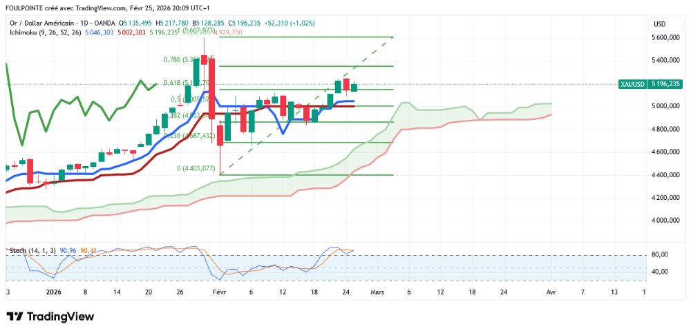 « Les acheteurs d'or doivent franchir rapidement les seuils de 5 200 $ et 5 300 $, faute de quoi l'essoufflement de la dynamique pourrait entraîner une chute du cours de l'or jusqu'à 4 380 $/oz – Hilal de Forex.com »