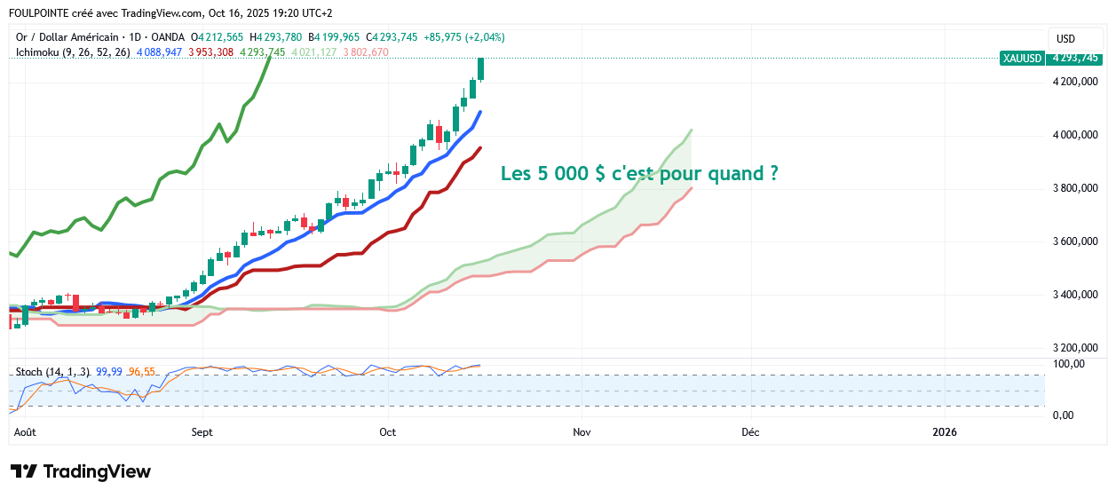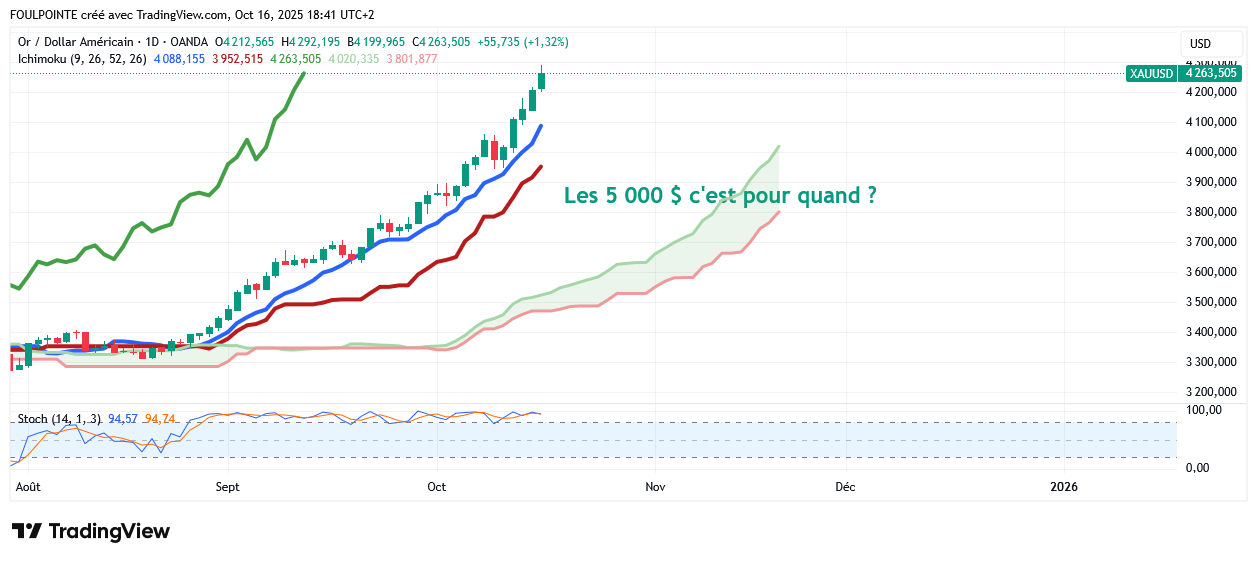 Ben la hausse me va bien, elle a des fondamentaux sérieux, solides, l’or ne monte pas dans le vide, c’est la monnaie en dernier ressort quand toutes les autres ont échoué, mais quand on était à 1800 $ les projections de Goldman Sachs sur les 2500 $ on les prenait avec des pincettes, on y croyait mais bon ça paraissait déjà top, alors si on nous avait dit qu’on taperait les 5000 $ on aurait peut-être eu du recul, mais non ils sont là, à portée de bougies, vertes bien sur, donc je me frotte les yeux sur ton graph en me disant on est sur les 5000 $ ce n’est pas un niveau sorti de nul part, il est là, il existe, c’est pas un niveau de la grotte de Platon, c’est un niveau de la vraie vie.