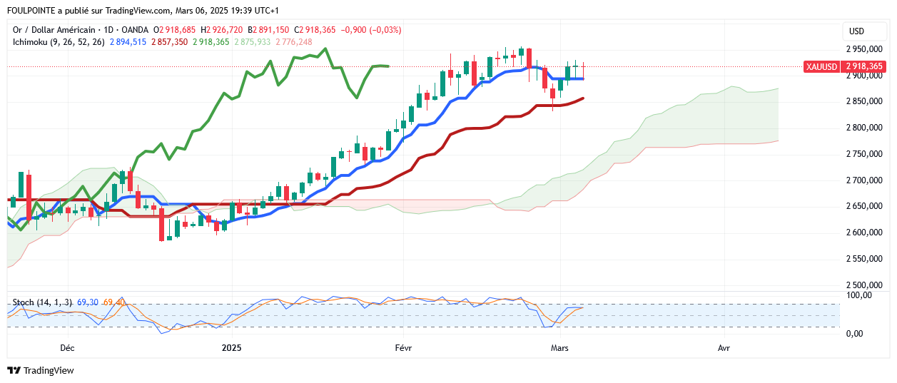 L'once d'Or en $ est en appui sur ses deux droites, tenkan et kijun, le tout au-dessus du nuage, avec une bonne marge de sécurité et une STO dans sa zone d'évolution normale et en position haussière.