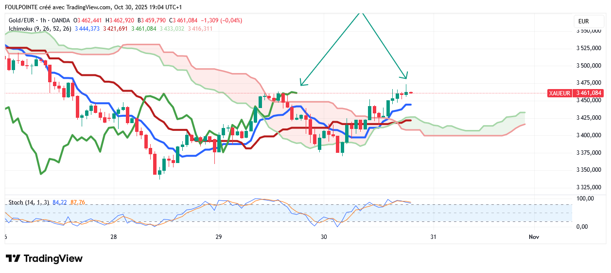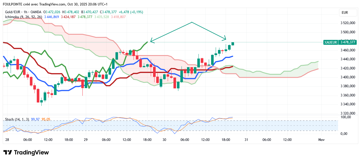 La sortie haussière de l'Or en €, en ut 1 heure et en Ichimoku a-t-il pour conséquence de lâcher les chevaux ?