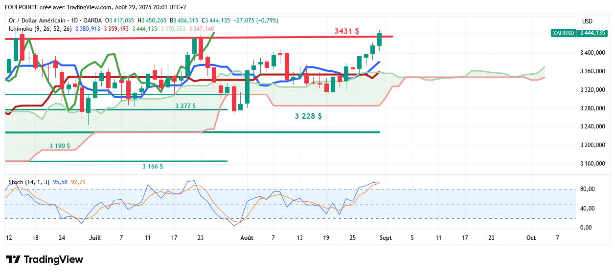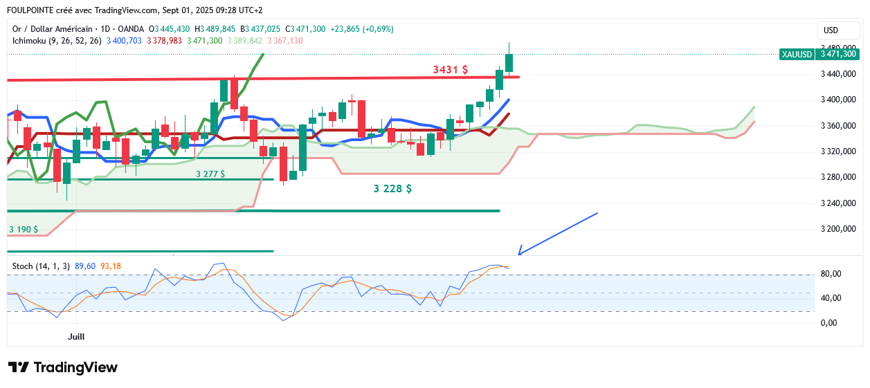 L'Or en $ a cassé les 3431 $, dernier plus haut en $ courant de tous les temps.