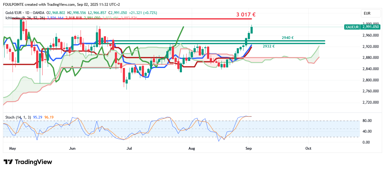 Si on passe la zone des 2932 € - 2940 € la voie est libre jusqu'aux 3017 €.