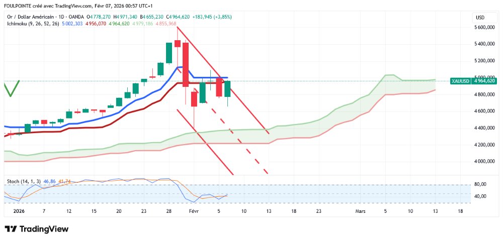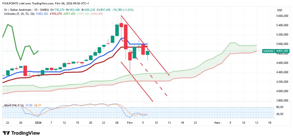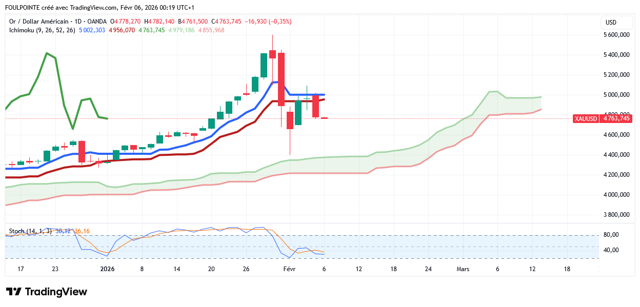 La banque prévoit que les prix de l'or maintiendront une tendance haussière générale, avec un prix moyen culminant à 6 500 $ l'once en 2027. Ces commentaires optimistes interviennent alors que l'or rencontre une nouvelle résistance à 5 000 $ l'once et semble entrer dans une nouvelle phase de consolidation. Le cours de l'or au comptant s'établissait à 4 863,10 $ l'once, en baisse de 2 % sur la journée.
