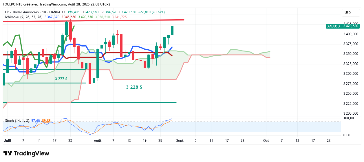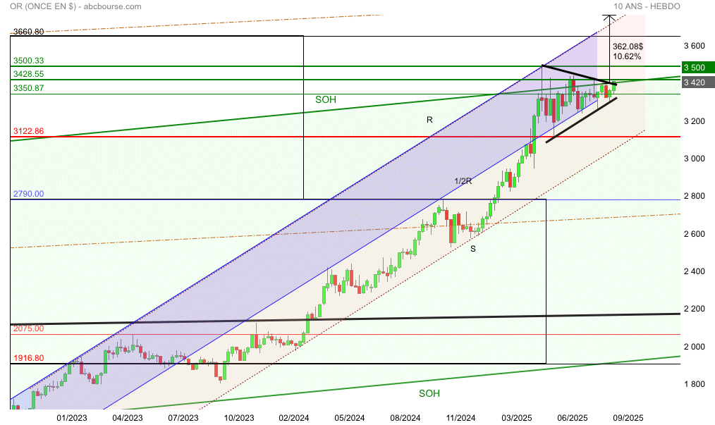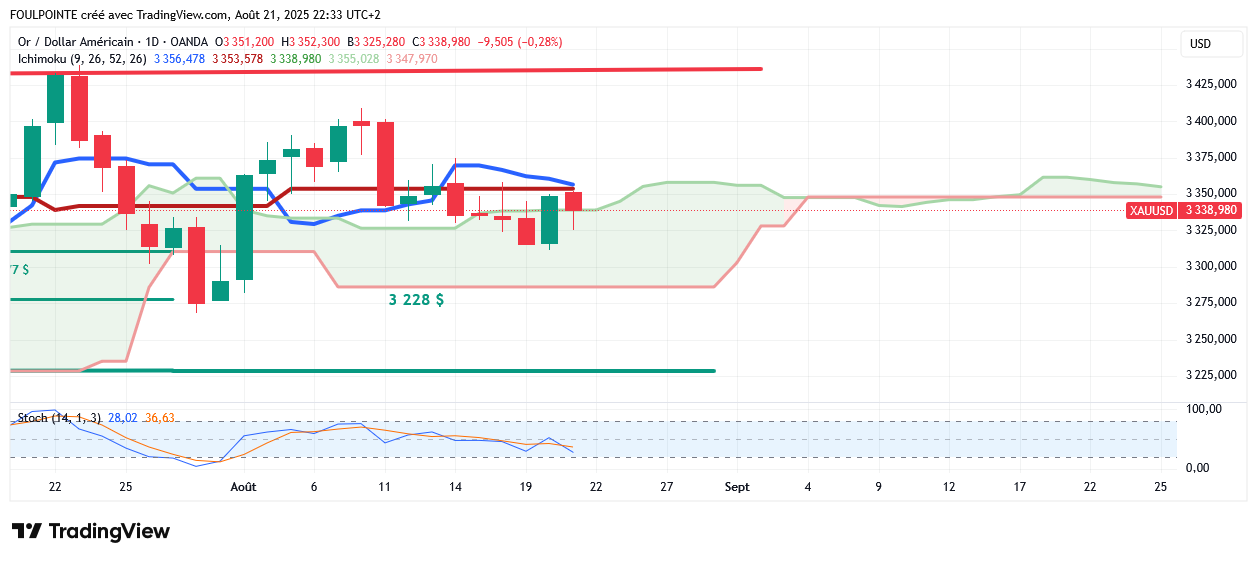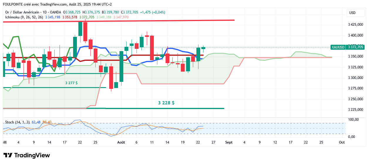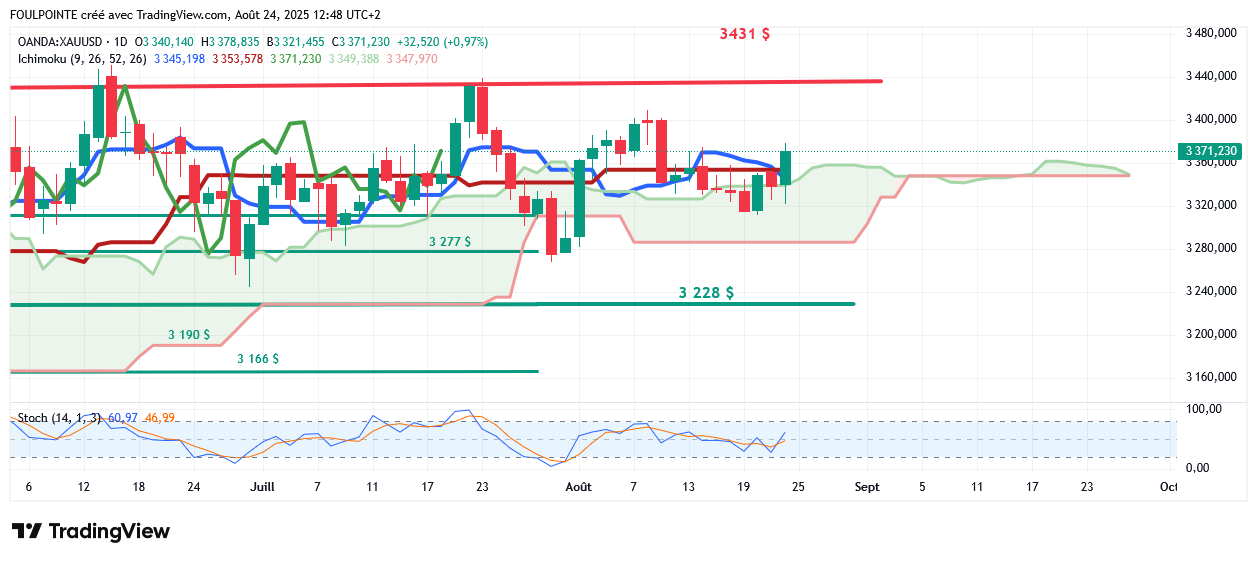 Le cours de l'or a atteint le sommet des 3 370 $ suite aux propos du président de la Fed, Jerome Powell, à Jackson Hole vendredi matin, et le métal jaune a maintenu sa fourchette haute suite aux propos globalement accommodants.