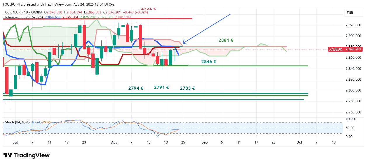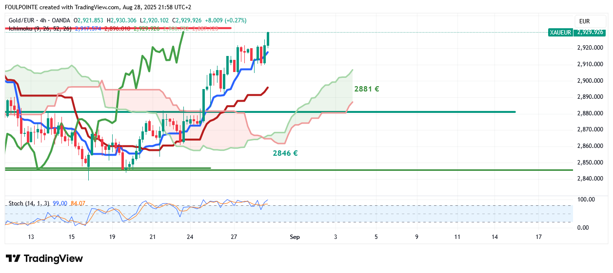 Pour le moment, et sans appui de la tenkan et de la kijun la hausse débutée le 18 août 2025 continue son petit bonhomme de chemin. Petite hausse de 0,19 %, mais hausse quand même. Qui plus est l'€ est en hausse contre la dollar de l'ordre de 0,45 %. A parité la hausse de l'Or en € serait de 0,55 %.