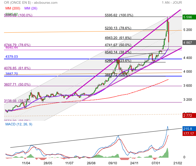 L’once à MOINS 15,40% par rapport à son sommet mais reste au dessus des 4600.