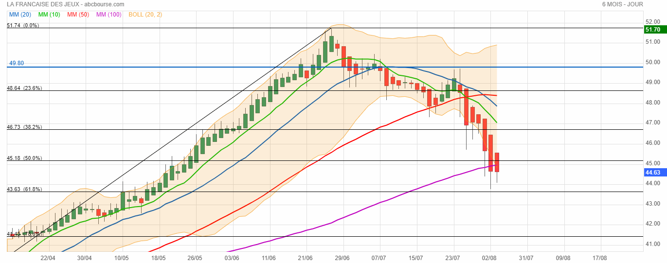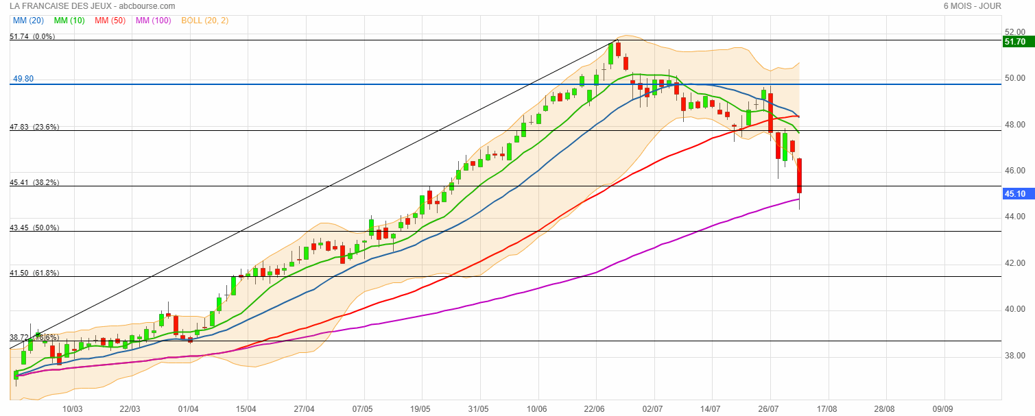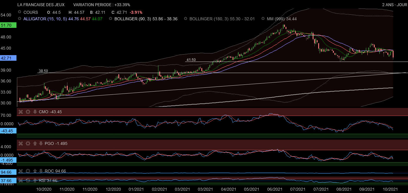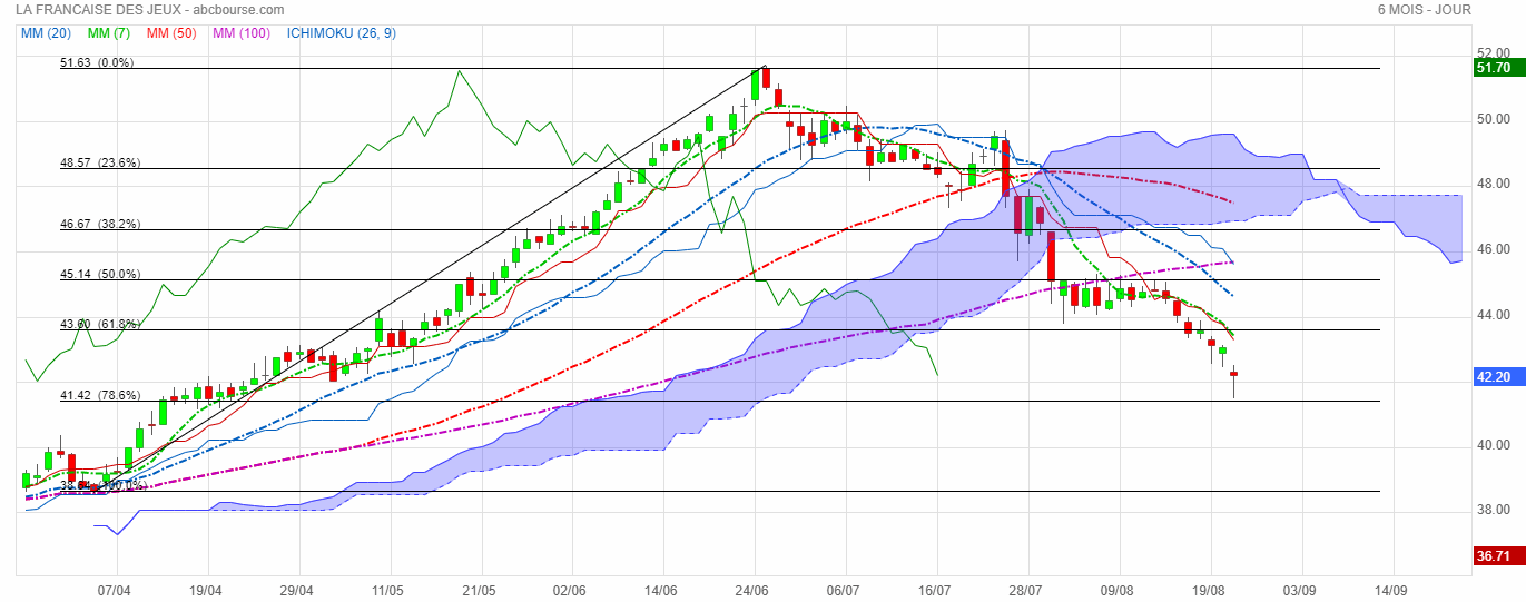 FDJ : tendance baissière , comme beaucoup de ses consœurs (Et dans «consœurs» il y a …?). Et pas qu’un peu, mon neveu !