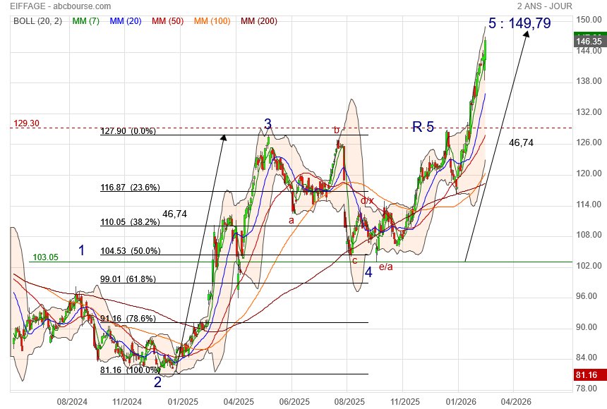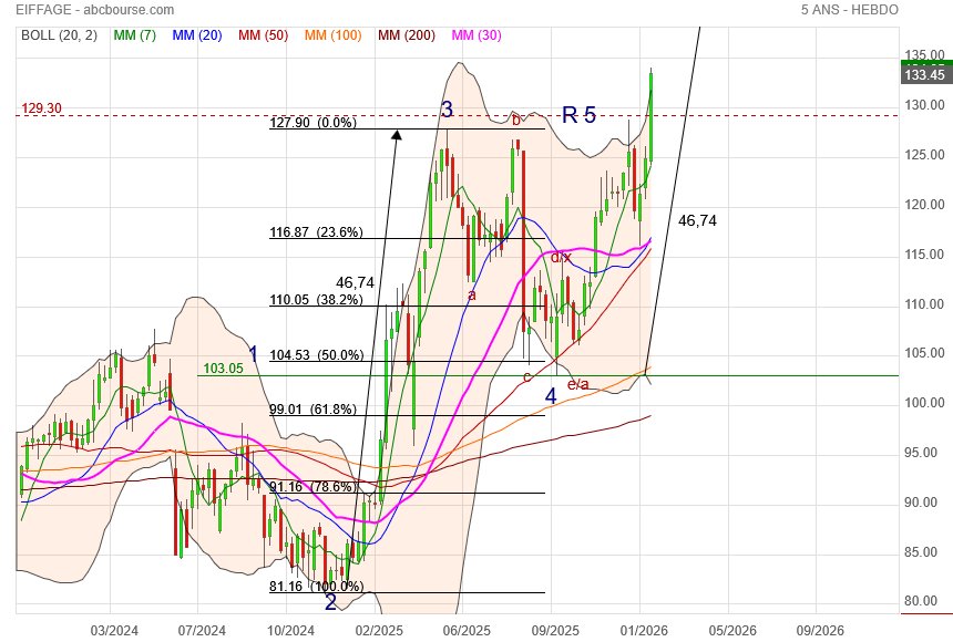 Eiffage revient en arrière de 0,4% à 106,50 euros ce jeudi, alors que le secteur BTP continue de profiter d'un momentum favorable en vue de gros investissements publics. Le titre a ainsi grimpé de 25% depuis le 1er janvier... Le chiffre d'affaires consolidé du groupe s'est établi dans ce contexte à plus de 23,4 milliards d'euros sur l'année 2024, en hausse de 7,3% à structure réelle par rapport à 2023 et de +3,7% à périmètre et change constants (pcc). L'activité est ressortie en augmentation de +8,6% sur le 4e trimestre. Le résultat opérationnel courant d'Eiffage a progressé de +3% à 2,5 MdsE, malgré l'incidence de la nouvelle taxe sur les autoroutes à hauteur de 123 millions d'euros (hausse de +8,2% hors TEITLD). Le résultat net consolidé part du groupe s'est élevé à 1,041 MdE, en croissance de +2,8% (+9,2% hors TEITLD). Le résultat net par action est de 11,07 euros (10,65 euros en 2023). Parmi les derniers avis de brokers, JP Morgan est à 'surpondérer' avec un objectif qui passe à 134 euros, tandis que Jefferies est toujours à l'achat sur le dossier en visant 119 euros, alors que Barclays reste à 'surpondérer' avec un objectif de 148 euros.